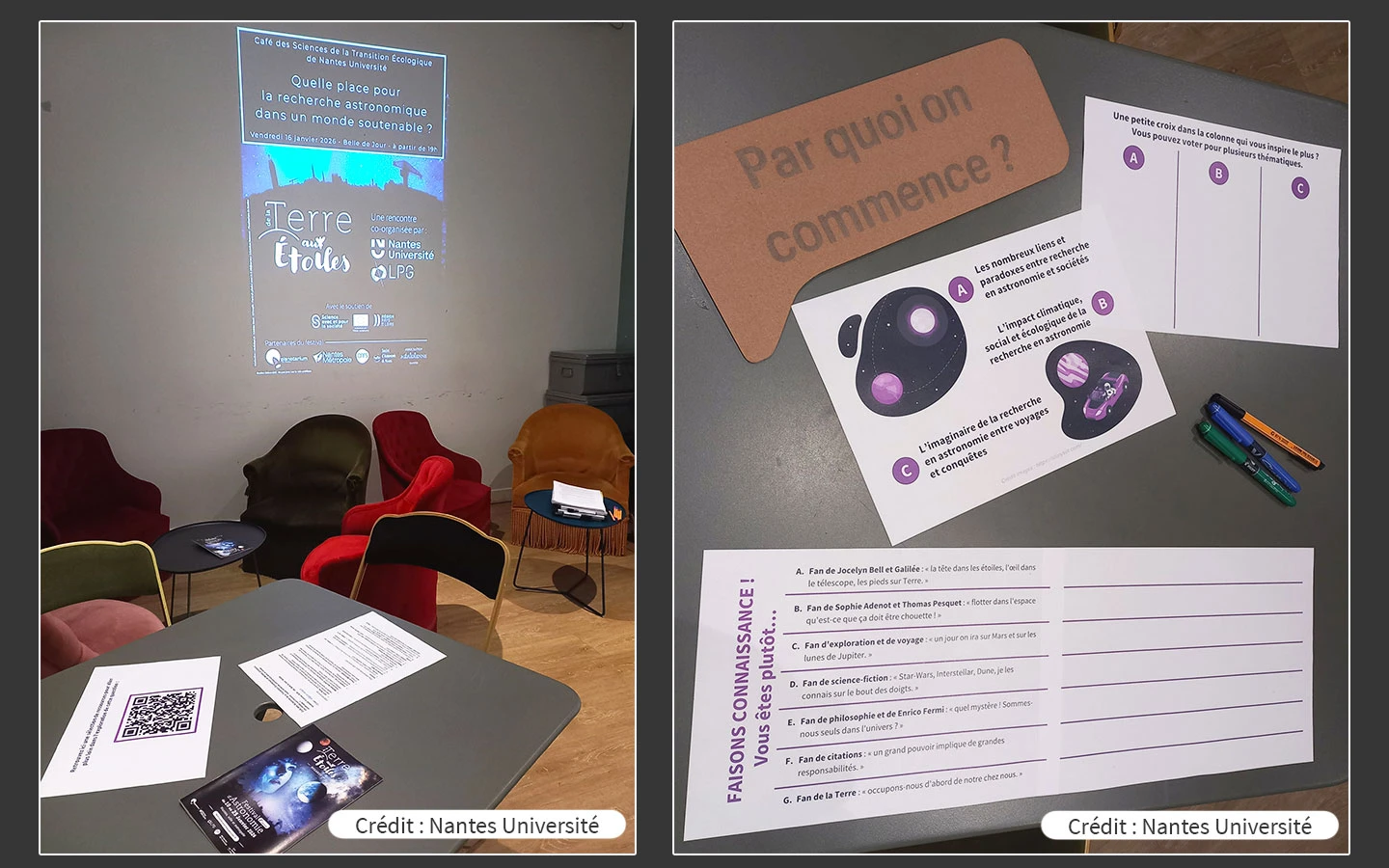 Dans le cadre du deuxième Festival d'Astronomie de Nantes, Nantes Université a donné rendez-vous au public le 16 janvier 2026 à 19h au bar-restaurant Belle de Jour pour une rencontre participative, conviviale et informelle avec des chercheur·es autour de la thématique de la recherche durable. Un événement co-construit par la mission Culture Scientifique et Technique de Nantes Université et le Laboratoire de Planétologie et Géosciences (CNRS, Le Mans Université, Nantes Université, Université d'Angers).