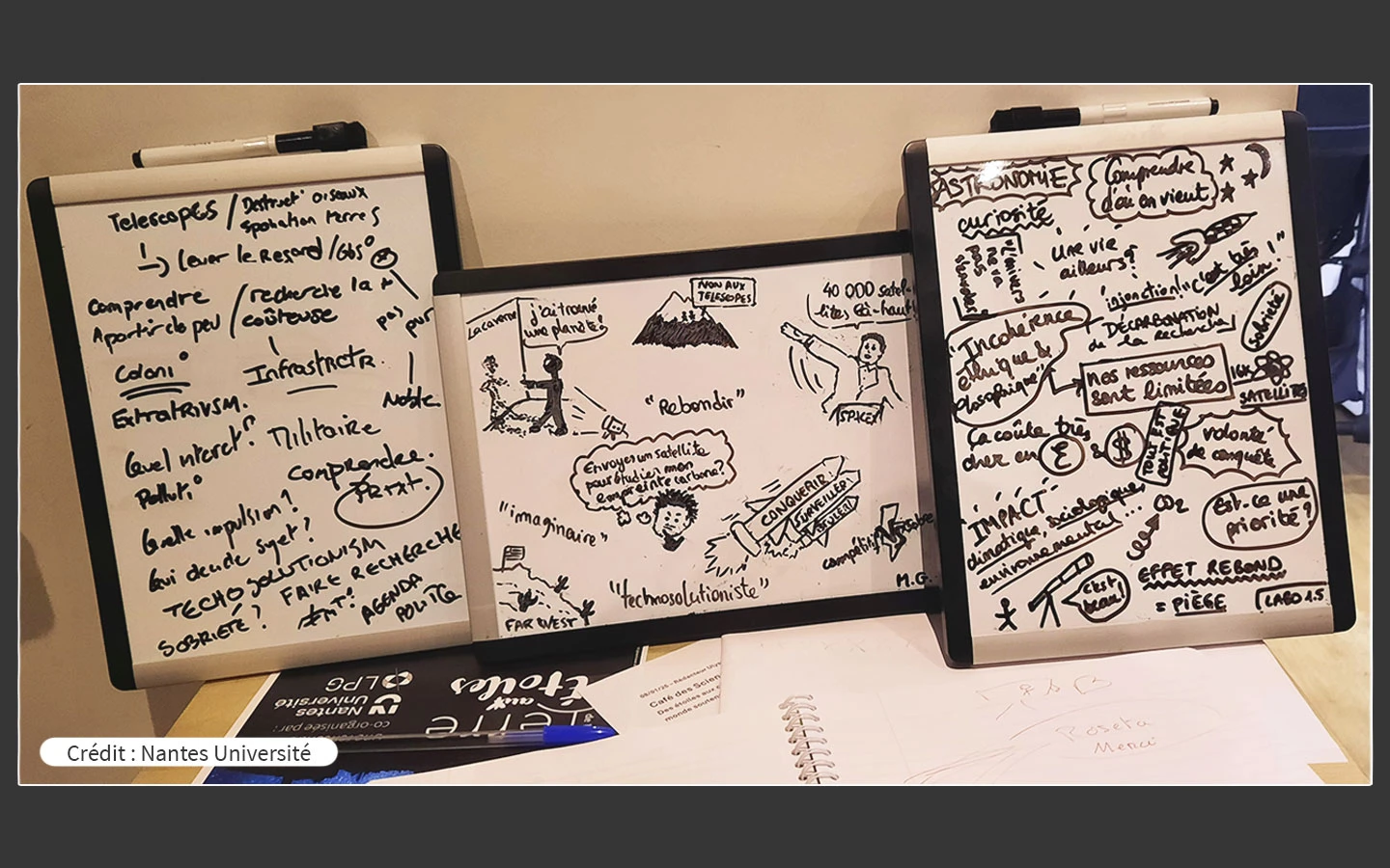 Alors, que conclure de cet échange de deux heures ? A la manière des sondes Voyager qui ont embarqué une archive de l'humanité à leur bord avant de quitter notre système solaire, le public a été invité à garder une trace de cet échange. Au lieu d'un disque d'or, ce sont ici des petites ardoises qui ont été utilisées. Le résultat est une collection de mots clés, d’idées fortes, d’interrogations et de problèmes non résolus. C'est aussi une galerie créative et inspirante, jugez plutôt.