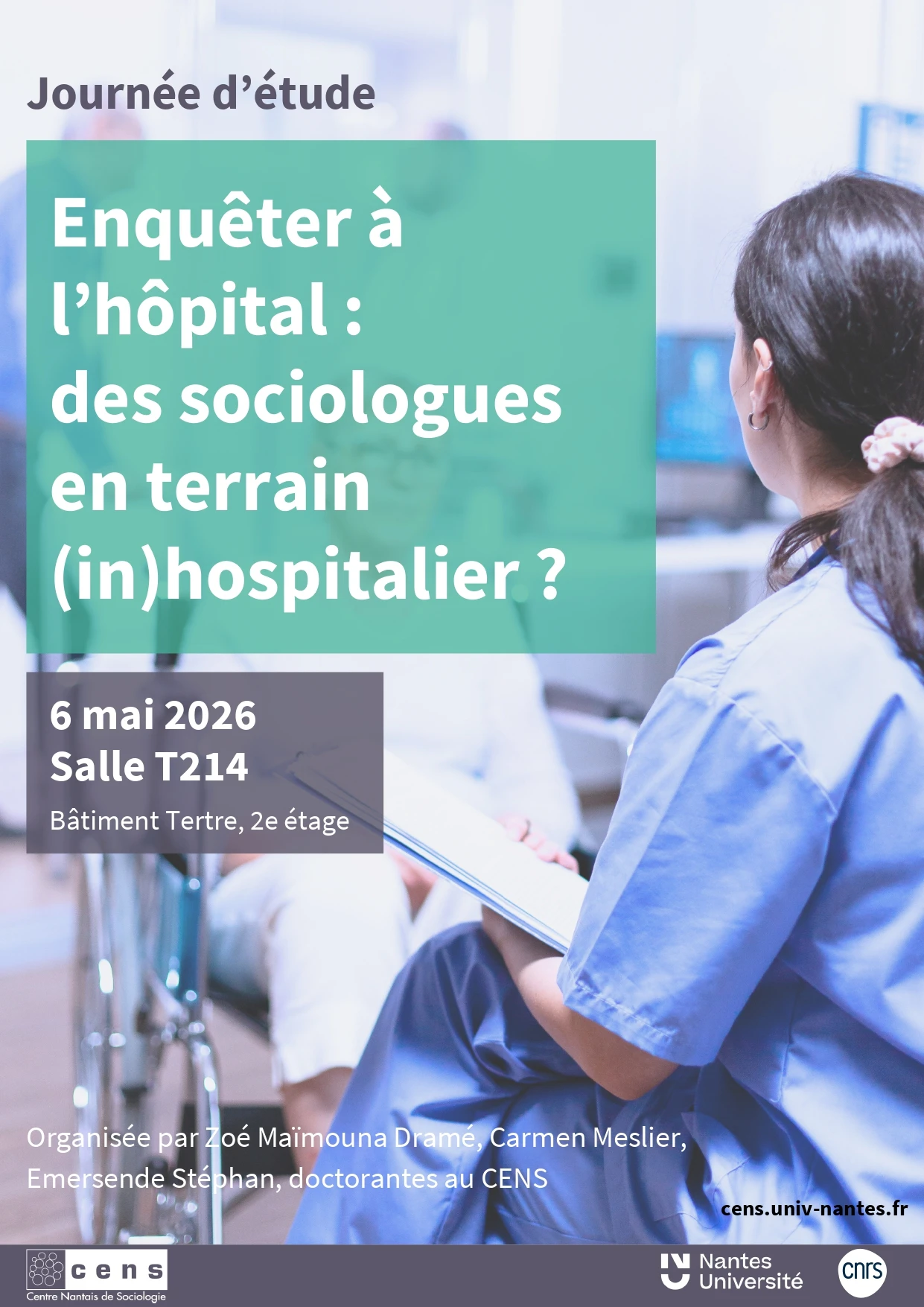 Trois doctorantes du Centre nantais de sociologie (Zoé Maïmouna Dramé, Carmen Meslier et Emersende Stéphan) organisent le 6 mai prochain une journée d'études avec pour thème : Enquêter à l'hôpital : des sociologues en terrain (in)hospitalier ?"