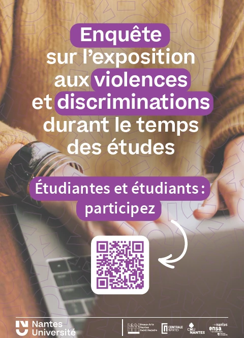 Du 19 janvier au 1er mars 2026, l'ensemble des étudiantes et étudiants de Nantes Université (dont Centrale Nantes, l’École nationale supérieure d'Architecture de Nantes, l’École des Beaux-Arts de Nantes Saint-Nazaire, les instituts de formation du CHU de Nantes et l’Institut de recherche technologique Jules Verne), est invité à participer à une grande enquête sur l’Exposition aux Violences, aux Discriminations et au racisme durant le temps des études.