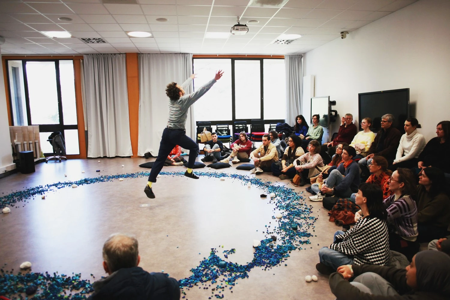 Intervalles prend la forme d’une performance entre danse et astrophysique, une traduction par la danse de la rencontre entre une matière terrestre (la lave) et une matière extra-terrestre (la météorite). Entre ces deux matières, entre ces deux dimensions, quel est l’espace qui les sépare ? Et entre les corps d’un·e spectateur·ice et d’un danseur, le temps d’un spectacle, quel est l’espace qui les rassemble ?