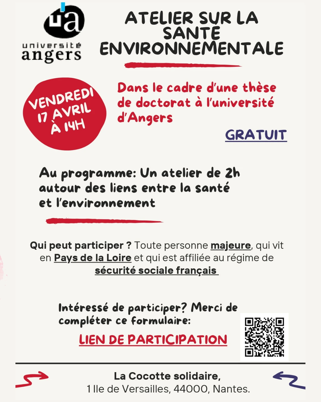 - Vendredi 17 avril, 14h-16h : Atelier sur la santé environnementale